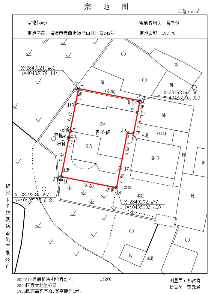 曾圣健个人民宅位于音西街道马山村,《福建省村镇建筑许可证》(建许字(1998)02B557号)许可建筑面积385㎡,层数3.5层。闽(2025)福清市不动产权第9035956号许可农村宅基地宗地面积193.7㎡。经音西街道审核确认该房屋于1998年12月23日竣工。按测绘单位出具房产报告,该民宅现状竣工面积为461.89㎡(其中第一层建筑面积为123.03㎡),层数4层。存在超面积及局部超用地建设的情况。该民宅业主现委托陈蓉萍向我局申请办理曾圣健个人民宅规划条件核实许可手续。